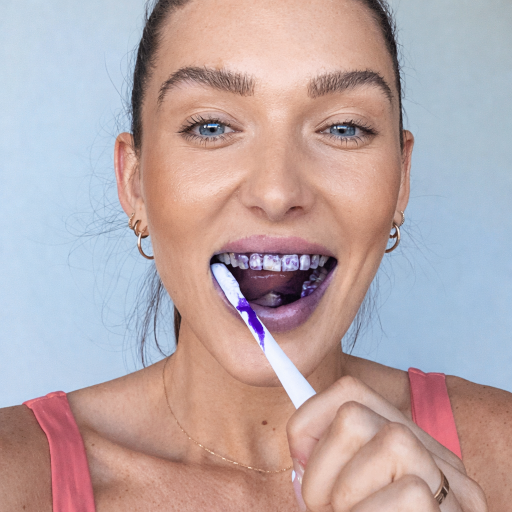 Colour correction all starts on the colour wheel, where purple and yellow are complementary colours opposite to each other. Using a similar concept to purple shampoo, applying purple onto your teeth can temporarily neutralise the yellow undertones to conceal them, revealing a perceptively whiter shade. Pretty cool right?